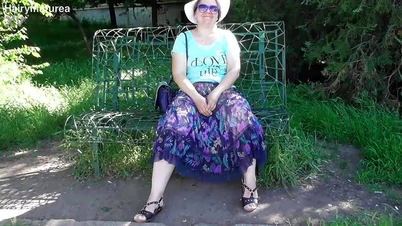 Hairy mature woman in a see-through dress outdoors