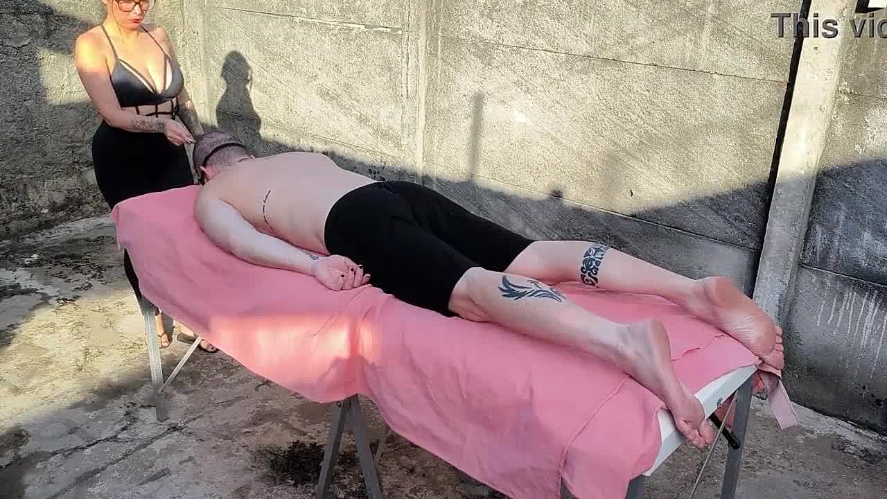 Young 18+ Slave Trained Outdoors with Big Tits and Bald Pussy by His Massive Cock