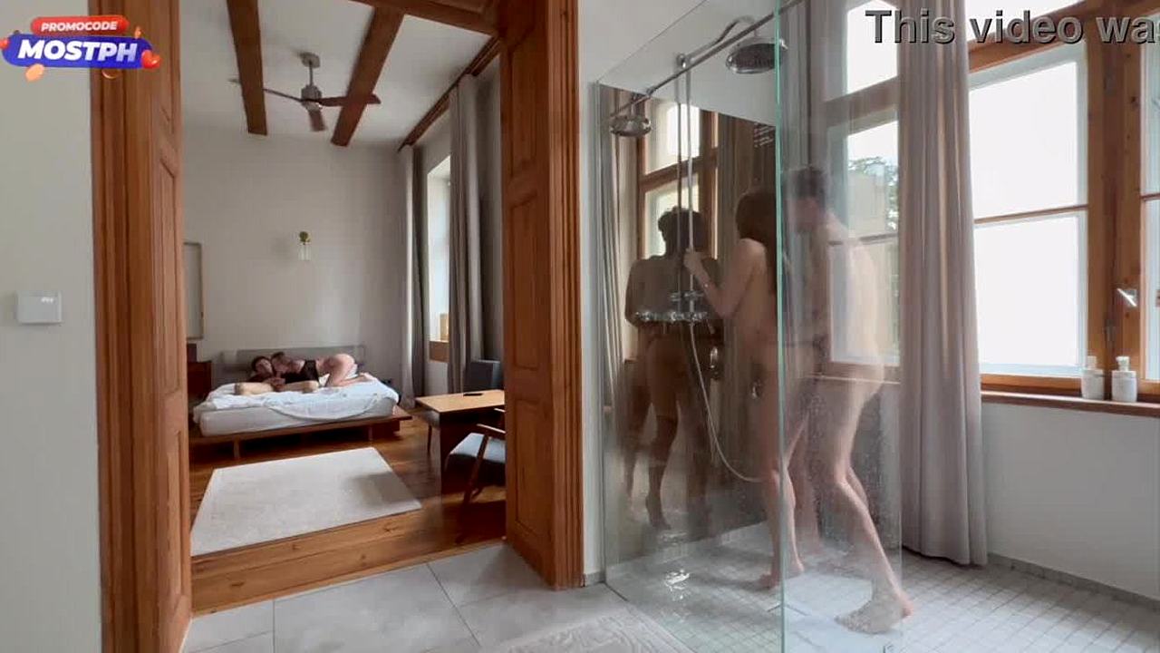 black guy joins her in the shower for some bathing fun